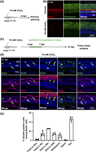 Neurogenic potential of proliferative Müller cells following a 10 mM CoCl2 intraocular injection in X. laevis. (a) Outline of the experimental procedure used in (b). Stage 51–54 tadpoles were intraocularly injected with a saline solution (control) or with 10 mM CoCl2. They were then processed for immunostaining 2 months post-injection (mpi). (b) Representative images of retinal sections co-labeled for Rhodopsin and Opsin. (c) Experimental procedure of the pulse-chase experiment performed in (d-e). Stage 51–54 tadpoles were intraocularly injected with 10 mM CoCl2 and subjected to BrdU exposure from 3 to 7 dpi to label all proliferative Müller cells. They were then processed for immunostaining at 21 dpi. (d) Representative images of CoCl2 injected retinas co-labeled at 21 dpi for BrdU and either Pax6 (identifying ganglion cells in the GCL and amacrine cells in the INL), Otx2 (identifying bipolar cells in the INL and photoreceptors in the ONL), Rhodopsin (rods), Opsin (cones), or Yap (Müller cells). White and yellow arrows point to double-positive cells in the INL and ONL, respectively. (e) Proportions of the different retinal cell types among BrdU-labeled ones. In (b, d), nuclei are counterstained with Hoechst. Data are represented as mean ± SEM, and each point represents one retina. GCL, ganglion cell layer, INL, inner nuclear layer, ONL, outer nuclear layer.
