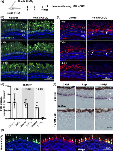 Specific cone cell death following a 10 mM CoCl2 intraocular injection in X. laevis. (a) Outline of the experimental procedure used in (b, c). Stage 51–54 X. laevis tadpoles were intraocularly injected with a saline solution (control) or with 10 mM CoCl2. They were then processed for immunostaining, in situ hybridization (ISH), or qPCR, at 3, 7, or 14 dpi. (b, c) Representative images of retinal sections labeled for Rhodopsin (b) or Opsin (c). Arrows point to mislocalized Opsin in the ONL (delineated by dashed lines). (d) qPCR analysis of opn1sw expression in control or 10 mM CoCl2-injected retinal extracts, at 3, 7, or 14 dpi. Data are represented as geometric mean with 95% CI (n = 3 technical replicates). (e) In situ hybridization analysis of opn1lw expression on retinal sections from control and 10 mM CoCl2-injected tadpoles, at 3, 7, and 14 dpi. (f) Representative images of a retinal section from a 10 mM CoCl2-injected tadpole, co-labeled for TUNEL and Opsin at 2 dpi. Arrows point to double-positive cells. Cell nuclei are counterstained with Hoechst. INL, inner nuclear layer; ONL, outer nuclear layer; OS, photoreceptor outer segments.