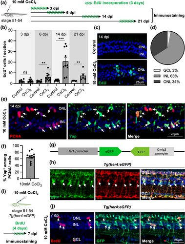 Müller glial cell proliferation following a 10 mM CoCl2 intraocular injection in X. laevis. (a) Outline of the experimental procedure used in (b–d). Stage 51–54 X. laevis tadpoles were intraocularly injected with a saline solution (control) or with 10 mM CoCl2. They were then exposed for 3 days to EdU before being processed for analysis at 3, 6, 14, or 21 dpi. (b) Quantification of EdU-positive cells per section. (c) Representative images of EdU-labeled retinal sections at 14 dpi. (d) Pie chart of EdU-positive cell distribution within the different retinal layers at 14 dpi in 10 mM CoCl2-injected tadpoles. (e) Representative images of retinal sections co-labeled for PCNA (proliferative cell marker) and Yap (Müller cell marker) at 14 dpi. (f) Quantification of Yap-positive cells among PCNA-labeled ones. (g) Schematic representation of the transgene Tg(her4:eGFP). The Her4 promoter drives eGFP expression in Müller glia, while the Cmlc2 (cardiac myosin light chain 2) promoter drives it in the heart, allowing for transgenic tadpole screening. (h) Representative images of a control Tg(her4:eGFP) retinal section, co-labeled for GFP and Glutamine Synthetase (GS; a marker of Müller cells). (i) Outline of the experimental procedure used in (J). Stage 51–54 transgenic Tg(her4:eGFP) tadpoles were intraocularly injected with 10 mM CoCl2, incubated for 4 days in BrdU, and processed for immunostaining against GFP and BrdU at 7 dpi. (j) Representative images. In (c, e, h, j), nuclei are counterstained with Hoechst. In (e, h, j), arrows point to double labeled cells. In graphs, data are represented as mean ± SEM, and each point represents one retina. **p < .01; ***p < .001; ns, not significant (Mann–Whitney tests). GCL, ganglion cell layer; INL, inner nuclear layer; ONL, outer nuclear layer.