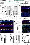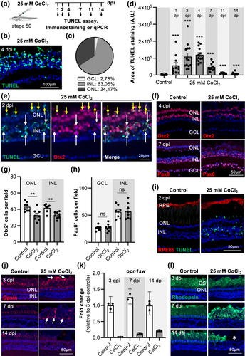 Bipolar and photoreceptor cell death following a 25 mM CoCl2 intraocular injection in X. laevis. (a) Outline of the experimental procedure used in (b–l). Stage 51–54 X. laevis tadpoles were intraocularly injected with a saline solution (control) or with 25 mM CoCl2. They were then processed for either TUNEL assay or immunostaining at different time points, as indicated. (b-e) Analysis of cell death by TUNEL staining. Shown in (b) is a representative section of a CoCl2-injected retina. The pie chart in (c) illustrates TUNEL-positive cell distribution within the different retinal layers at 2 dpi. The graph in (d) shows the quantification of the TUNEL staining area. Shown in (e) are representative retinal sections co-labeled for TUNEL and Otx2. Arrows point to double-positive cells within the ONL (yellow) and INL (white). (f–h) Immunostaining analysis of Otx2 and Pax6 expression, at 4 and 7 dpi respectively. Representative retinal sections are shown in (f) and corresponding quantifications in (g, h). (i) Representative images of retinal sections co-labeled for TUNEL and RPE65 (an RPE marker) at 2 dpi. (j) Immunostaining analysis of Opsin expression on retinal sections at 3, 7, and 14 dpi. Arrows point to mislocalized Opsin. (k) qPCR analysis of opn1sw (opsin1, short-wave-sensitive) expression in retinal extracts. Data are represented as geometric mean with 95% CI (n = 3 technical replicates). (l) Immunostaining analysis of Rhodopsin expression on retinal sections at 3, 7, and 14 dpi. The asterisk indicates the absence of rods. In all images, nuclei are counterstained with Hoechst. Except in (k), data are represented as mean ± SEM, and each point represents one retina. ns, not significant, **p < .01, ***p < .001 (Mann–Whitney tests). GCL, ganglion cell layer; INL, inner nuclear layer; ONL, outer nuclear layer; RPE, retinal pigmented epithelium.