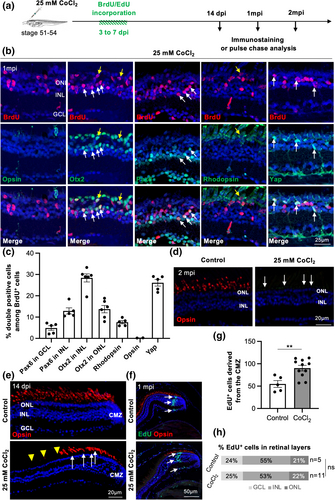 Neurogenic potential of Müller glia and CMZ cells following a 25 mM CoCl2 intraocular injection in X. laevis. (a) Outline of the pulse-chase experiment performed in (b-h). Stage 51–54 X. laevis tadpoles were intraocularly injected with a saline solution (control) or with 25 mM CoCl2. They were then exposed to EdU or BrdU from 3 to 7 dpi and finally processed for EdU or BrdU staining and immunolabeling at different time points, as indicated. (b) Representative images of retinal sections from CoCl2-injected tadpoles, co-labeled for BrdU and either Pax6 (identifying ganglion cells in the GCL and amacrine cells in the INL), Otx2 (identifying bipolar cells in the INL and photoreceptors in the ONL), Rhodopsin (rods), Opsin (cones), or Yap (Müller cells). White and yellow arrows point to double-positive cells in the INL and ONL, respectively. (c) Proportions of the different retinal cell types among BrdU-labeled ones. (d) Opsin immunolabeling on retinal sections at 2 mpi. Arrows highlight the complete absence of staining in CoCl2-injected retinas. (e) Representative images of retinal sections at the level of the CMZ. White arrows point to newborn cones produced by the CMZ. Yellow arrowheads indicate the absence of cones more centrally. (f) Representative images of retinal sections stained for EdU and Opsin at 1 mpi, after an EdU-pulse from 4 to 7 dpi. Arrows point to CMZ-derived newborn neurons (EdU-positive) in the different retinal layers. (g) Quantification of CMZ-derived EdU-positive cells. (h) Distribution of CMZ-derived EdU-positive cells within the three retinal layers. In all images, nuclei are counterstained with Hoechst. In (c, g), data are represented as mean ± SEM, and each point represents one retina. **p < .01; ns, not significant (Mann–Whitney tests (c, g) or two-way ANOVA (h)). CMZ, ciliary marginal zone; GCL, ganglion cell layer; INL, inner nuclear layer; ONL, outer nuclear layer.