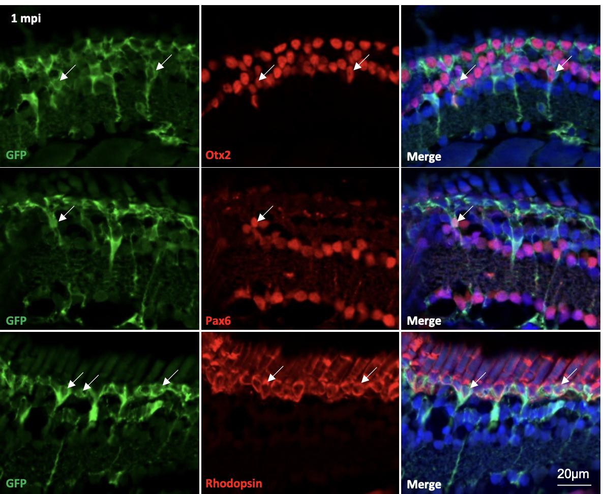 in the INL), or Rhodopsin (rods) at 1 mpi. Arrows point to double-positive cells.