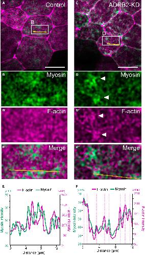 Figure 6. ADRB2 facilitates actomyosin complex on the apical surface of the epidermis(A–D″) Live imaging of the apical surface of the epidermis injected with LifeAct-rfp and SF9-gpf. (A–B')': control embryos; (C–D')': knockdown embryos. Arrowheads indicate excess myosin accumulation in the knockdown embryos. Scale bar: 20 μm.(E and F) Plot profile of raw intensities for LifeAct-RFP and SF9-GFP along the drawn line (yellow) in images (B'') and (D''), respectively. The pink dotted lines in F indicate overlapping peaks between LifeAct-RFP and SR9-GFP. |
