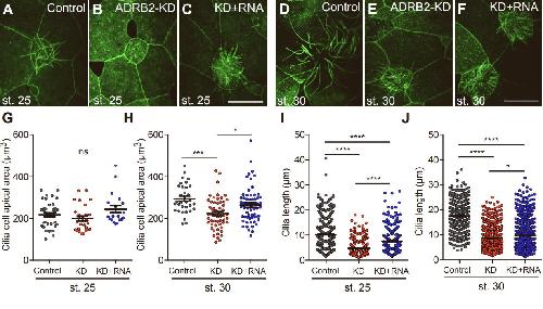Figure S4. ADRB2 is required for normal ciliated cell insertion and ciliogenesis. Related to Figure 4. (A–F) Live-imaging of membrane-GFP in the epidermis at stages 25 (A: control-MO injected, B: adrb2-MO injected, C: adrb2-MO and adrb2-5mis RNA injected) and 30 (D: control-MO injected, E: adrb2-MO injected, F: adrb2-MO and adrb2-5mis RNA injected). Scale bar: 20 µm. (G, H) Measurement of the apical cell area of ciliated cells at stages 25 (G) and 30 (H). (*p=0.036, ***p=0.0001, one-way analysis of variance) (I, J) Quantification of cilia length at stages 25 (I) and 30 (J). (****p<0.0001, *p=0.0154, one-way analysis of variance). Data are represented as mean +/- SEM. |