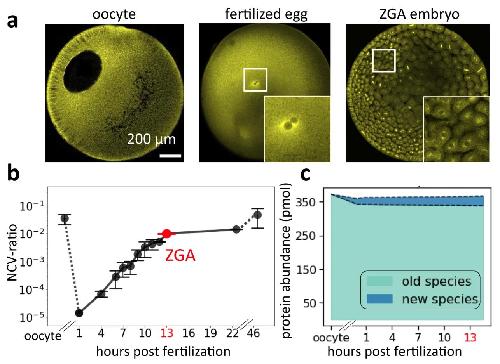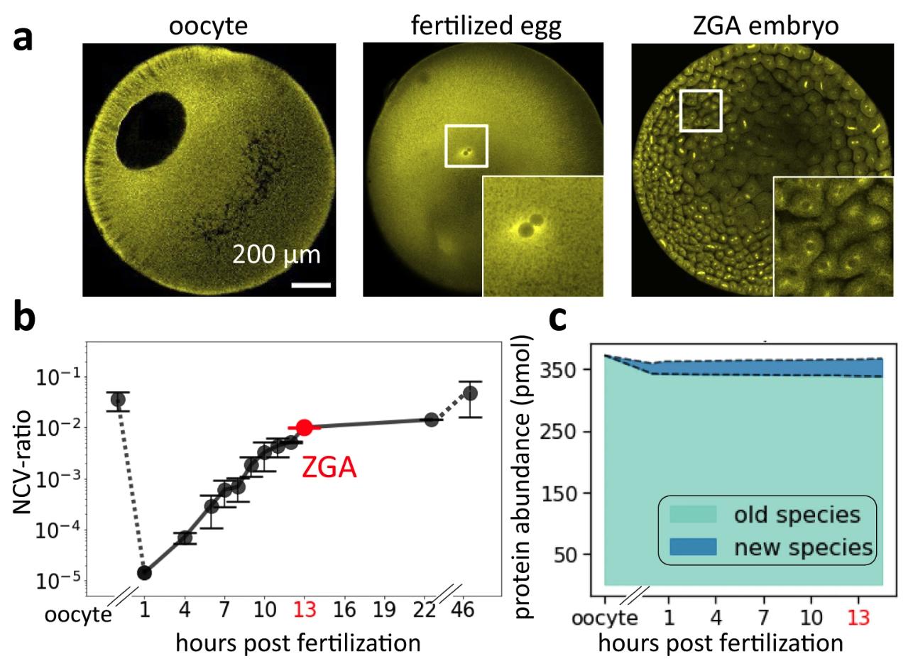 Figure 1. a Immunofluorescence images (anti-tubulin) of early frog development show drastic changes in nuclear morphology. The large oocyte (~1.2 mm diameter) contains a proportionally large nucleus (~400 μm). After fertilization, the nucleus is only ~30 μm in diameter. Around zygotic genome activation (ZGA), the embryo contains ~4000 cells with ~18 μm diameter nuclei. The represented images were independently repeated multiple times and observed with similar results. b The nucleocytoplasmic volume ratio (NCV-ratio) in early frog development, quantified based on micrographs. The NCV-ratio drops ~10,000-fold from oocyte to fertilized embryo before increasing exponentially during early cleavage stages. After ZGA, the NCV-ratio gradually increases, approaching the value observed in the oocyte. Solid dots are the mean NCV ratios. Error bars indicate standard deviation. Volume quantification and sample sizes for each time point are provided in Source Data. Embryos developed at 16 °C. c Quantification of the fraction of the nuclear proteome replaced by new protein species from oocyte to ZGA. Despite the drastically increasing NCV-ratio from the fertilized egg to ZGA, only ~3% of the nuclear proteome is replaced by newly synthesized canonical nuclear proteins (the main contributors are high abundant histones, which increase ~2-fold). |