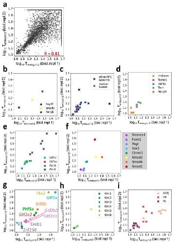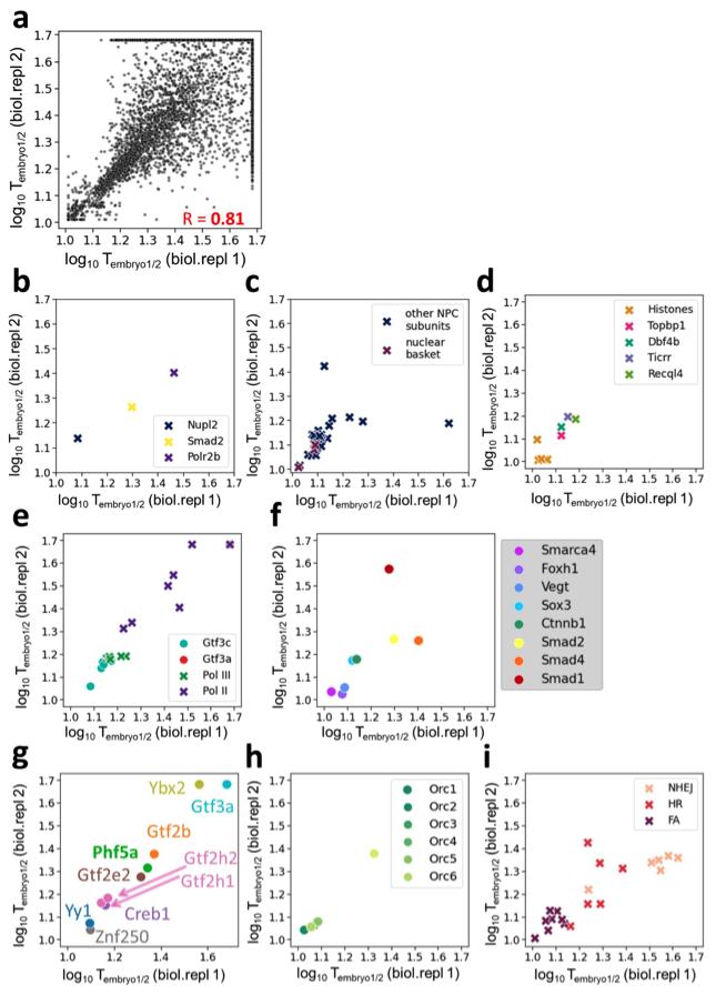 Supplementary Figure 3: The level of reproducibility of the embryonic nuclear proteome experiments on the proteome-wide scale and on individual groups of protein discussed throughout the manuscript. a, Scatter plot of two biological replicates to determine Tembryo1/2 of nuclear entry into embryonic nuclei. We observe a Pearson correlation of 0.81 (two-tailed p-value < 1e-325) with lower reproducibility at late Tembryo1/2. b-i, Correlation plots for highlighted proteins discussed in the manuscript are separated into different panels, corresponding to the associated figures in the main text. Below are the pairs of the presented panel and the corresponding figure in the manuscript: panel (b) – Fig. 2b, panel (c) – Fig. 2e & Supplementary Fig. 3b, panel (d) – Fig. 3a, panel (e) – Fig. 3b & Supplementary Fig. 4, panel (f) - Fig. 3c, panel (g) – Fig. 5c, panel (h) – Supplementary Fig. 4a, panel (i) – Fig. 2d. |