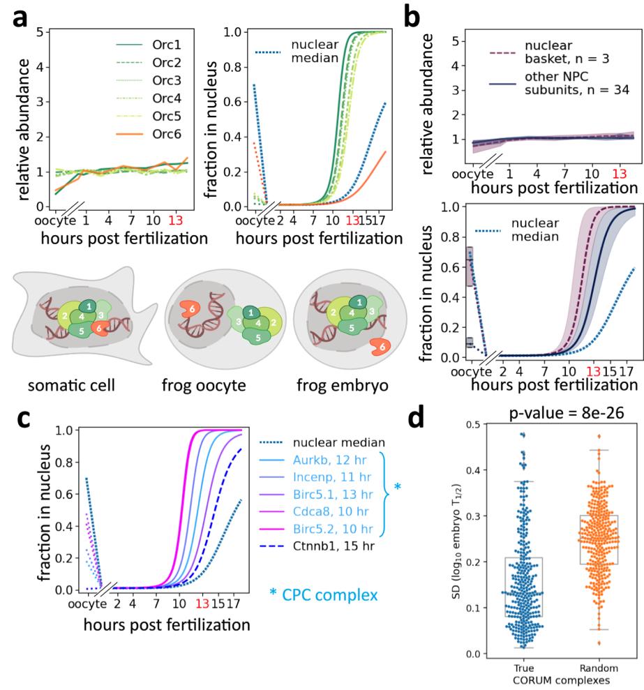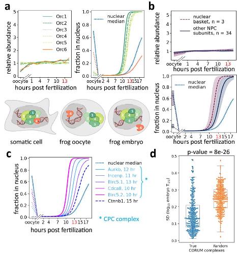 Supplementary Figure 4: Quantifying protein NC partitioning reveals sequential nuclear entry in early embryos. a-d, embryos developed at 16°C. Solid lines indicate median nuclear titration patterns and shaded areas 50% spread. a, Core subunits of the origin of replication complex (ORC) enter the nucleus at different times. Left: Relative protein abundances of ORC subunits stay approximately constant from fertilization to ZGA. Right: Orc6 enters embryonic nuclei later than other components, consistent with previous observations of cytoplasmic function in Drosophila and mammals [5]. While Orc1-6 localize in somatic nuclei, Orc1-5 are cytoplasmic and Orc6 is nuclear in the oocyte [4,6]. In early embryos, Orc1-5 rapidly enter the nuclei, presumably to accommodate for function in Xenopus embryos’ DNA replication process [7]. Bottom: Cartoon model summarizing NC partitioning of ORC core subunits in the oocyte, embryo, and somatic cells. b, Nuclear basket proteins show different NC partitioning in early development than other nuclear pore complex (NPC) proteins. Top: Yet, nuclear basket proteins demonstrate constant expression levels during early development. Bottom: The nuclear basket is mostly nucleus-localized, contrasting NPC proteins being generally equidistributed between nucleus and cytoplasm in the oocyte. Nuclear basket proteins titrate into the nucleus slightly faster than other subunits. Previous observations indicate nuclear baskets are not part of the annulate lamellae but interact with actin filamentous networks connecting NPC to chromatin in oocyte nuclei [8]. c, The CPC complex was equidistributed between the nucleus and cytoplasm in the oocyte. However, CPC components is sequestrated into the embryonic nuclei. The transcription factor beta-catenin (Ctnnb1) is cytoplasmic in the oocyte but is among early nuclear-imported proteins [9,10]. d, Protein complex subunits co-import into nuclei. The standard deviation of nuclear entry time of each complex measured in the embryonic assay (blue) versus those of complexes with shuffled subunits (orange)11 (Wilcoxon-rank two-sided test with N=311 biological independent complexes p- value ~8e-26). Box plots of the range from Q1 to Q3 and 1.5* IQR whiskers are shown. |