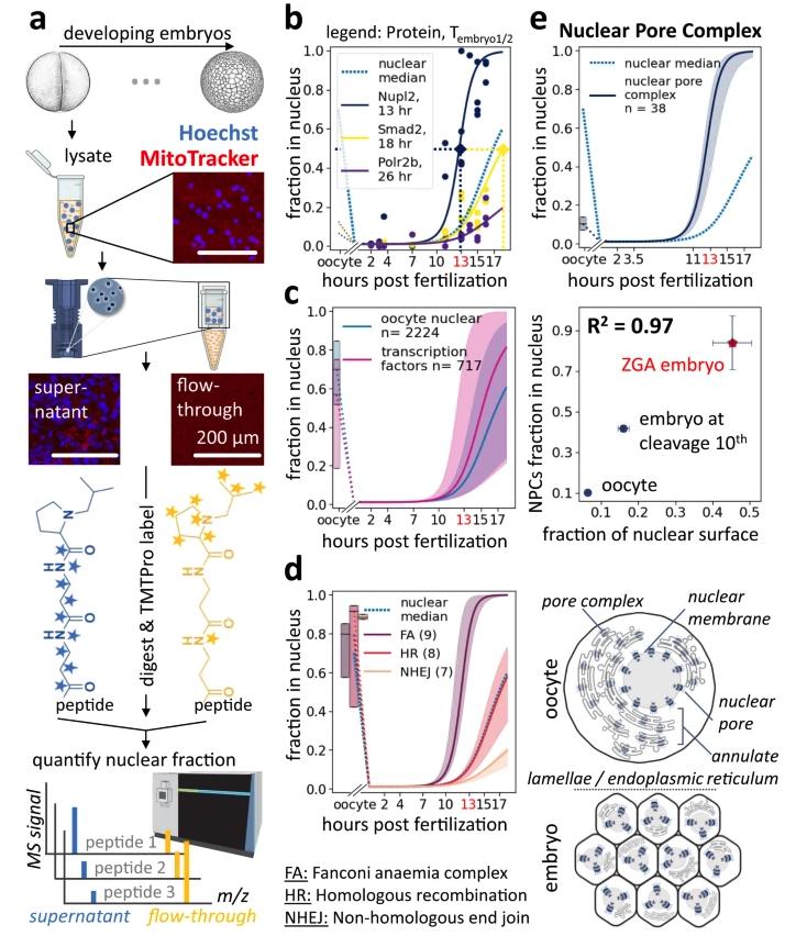 Fig. 2: Quantification of nucleocytoplasmic partitioning during early development. a. Assay to quantify nucleocytoplasmic partitioning via multiplexed proteomics. Embryonic lysate, developed at 16C, was collected at various stages: nuclei were enriched by filtration through membranes of defined pore sizes. Shown are example epifluorescence images of lysate, supernatant, and flow-through stained with Hoechst (blue) and MitoTracker (red). Supernatant and flow-through fractions were digested into tryptic peptides, labeled with isobaric tags, and subjected to accurate multiplexed proteomic analysis. Xenopus illustrations Natalya Zahn (2022) [86,95]. b Nucleocytoplasmic partitioning quantification for three examples. Dots indicate measured fraction of each protein in nuclei. Solid lines indicate fit sigmoids. Blue dashed line indicates median fit from all nuclear proteins. c. Quantification of time-dependent nuclear fraction for ~2k nuclear proteins and ~600 transcription factors (TFs) [20,71,96]. Solid line indicate the median and shaded area 50% spread. d, e Measurements for multisubunit protein complexes. Solid line indicates the median and shaded area 50% spread. d. DNA repair complexes enter embryonic nuclei at various times, yet their subunits enter simultaneously. Shown are nuclear entry quantifications for homologous recombination (HR), the nonhomologous DNA end-joining repair (NHEJ), and the Fanconi anaemia (FA). An apparent time delay of nuclear entry for some DNA repair complexes explains previous observations that early embryos bypass DNA repair to accommodate fast cell divisions [30,31,32]. Oocyte nuclear fractions are shown as standard box plots. e Change in nucleocytoplasmic partitioning for nuclear pore complex (NPC) subunits. Top: Our nuclear fraction measurement for NPC proteins shows rapid incorporation onto embryos exponentially increasing nuclear surface. Middle: Quantification of NPC nuclear fraction via MS agrees well with immunofluorescence-quantified nuclear surface change. The x-axis is the relative nuclear surface measurement to that of embryos at 22.5h post-fertilization. Bars indicate standard errors. Bottom: Illustration of dynamic localization of NPC proteins in the oocyte versus the embryo. Oocyte stores NPC subunits in endoplasmic reticulum membranes embedded with pore complexes, called annulate lamellae [34,35]. |