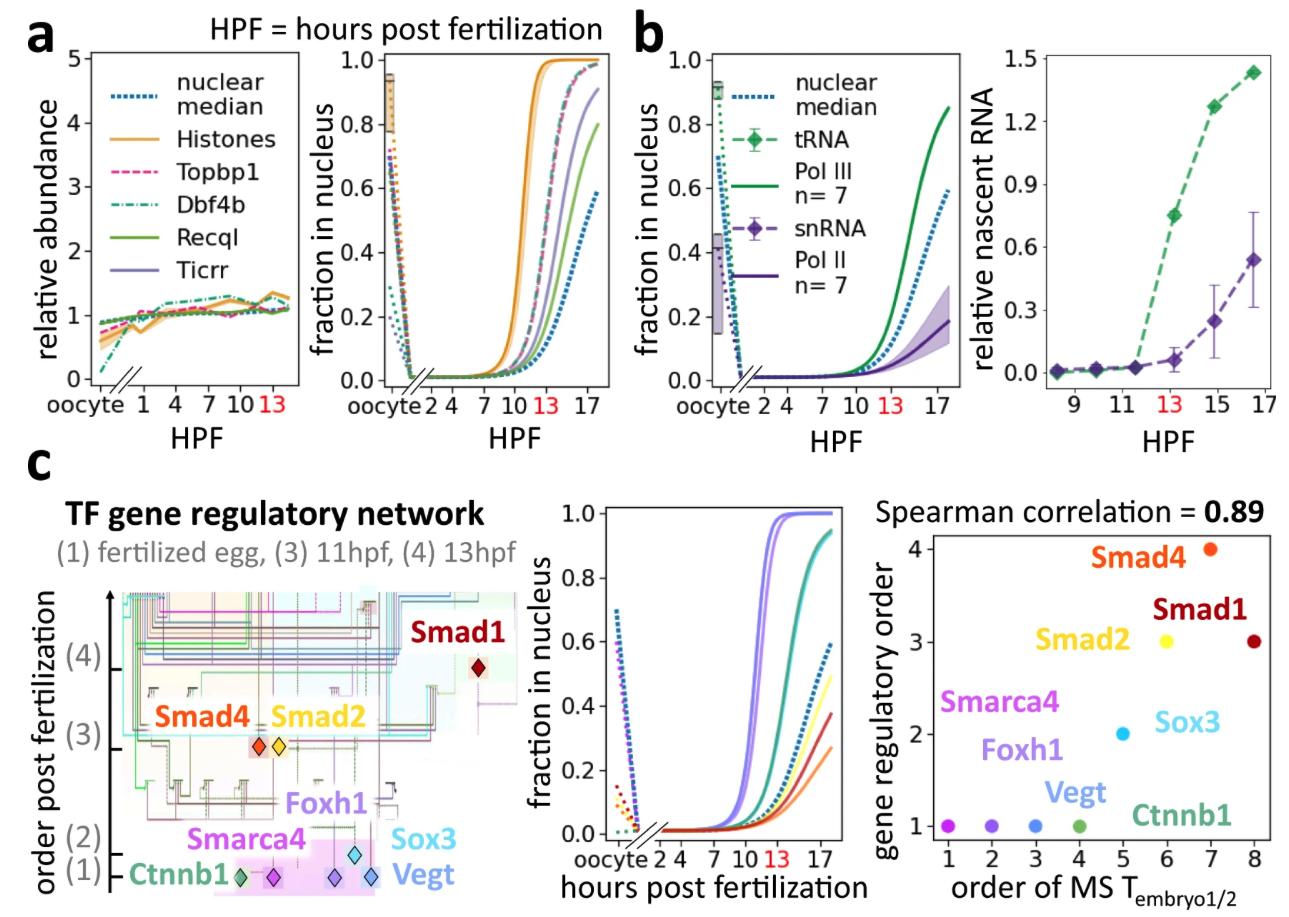 Fig. 3: In early development, proteins enter nuclei sequentially correlating with the onset of their nuclear functions. a–c Embryos developed at 16 °C. a Left: Protein abundance dynamics of previously reported ZGA key regulatory factors change little from fertilization to the ZGA [15,16]. Right: These regulators are among the earliest proteins to titrate into embryonic nuclei. Shown are fits of individual ZGA regulators and the median fit of the core histones (H2a, H2b, H3, and H4) and their isoforms with 50% spread. b RNA polymerase III (Pol III) and II (Pol II) enter nuclei at different times of development, which corresponds to the respective appearances of their first downstream transcripts. Left: Proteomics data show that Pol III subunits titrate into nuclei before Pol II subunits. Shown are median and 50% spread of unique subunits. Right: The first tRNA transcripts, transcribed by Pol III, and snRNA, transcribed by Pol II, show corresponding timing to the nuclear entry of their corresponding polymerases. The RNA measurements are quantified from Newport and Kirschner’s RNA gel of newly synthesized transcripts [13]. Error bars indicate standard deviation of five snRNA species (snRNA U1, U2, U4, U5, U6). c Timing of the nuclear import of TFs in the mesendoderm gene regulatory network corresponds to the timing of their activation. Left: Transcriptional activation order in early Xenopus embryos (Adapted drawing from Charney et al. [24] and [43,44]). Middle: MS-quantification of nuclear import in early development for these TFs. Right: Scatter plot of rank between the measured nuclear entry Tembryo1/2 by MS and the reported temporal gene regulatory network shows strong agreement (Spearman correlation of 0.87, two-tailed p-value = 0.005). |