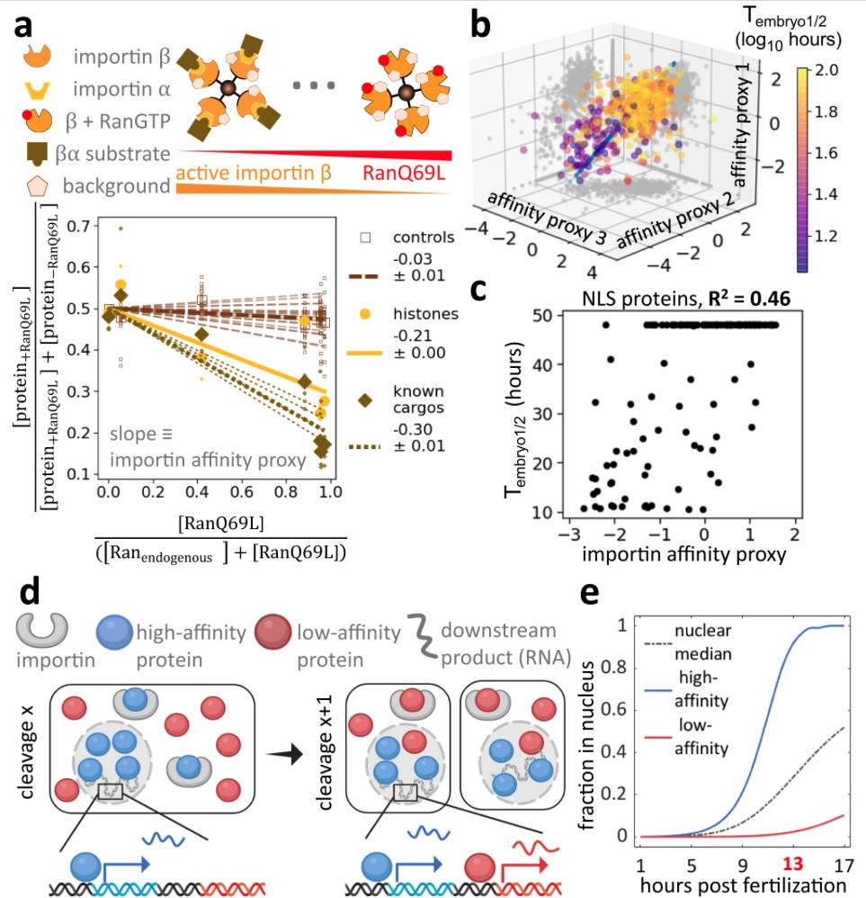 Fig. 4: The affinity of proteins to importin contributes significantly to their ordering of nuclear entry in early development. a Estimation of proteome-wide affinity to importin a/B. We quantified changes in protein abundance associated with importin beads among conditions with varying amounts of RanQ69L. Abundance of known importin a/B substrates [53], including histones, decreases with increasing RanQ69L concentration. Large dots represent the median protein fraction of a protein subgroup at each RanQ69L concentration, while small dots represent measurements for individual proteins. We applied a linear fit for each protein with a fixed y-intercept and used the slope to proxy for a protein’s affinity to importin. b Scatter plot of triplicate affinity proxy measurements from experiments outlined in (a). We integrated these measurements to one dimension using cross-validated canonical correlation analysis [49]. c Importin affinity can explain a significant fraction of the timing of nuclear entry in early development. The scatter plot shows T embryo 1/2 versus importin a/B affinity proxy. The observed Pearson correlation suggests that importin affinities can explain >46% of the variance of the timing of nuclear entry or NLS containing proteins in early embryonic development. d Schematic of our proposed model in which the differential affinity of proteins to importin controls the timing of genomic access in embryonic development. A high-affinity protein titrates into the nucleus faster than a low-affinity protein, resulting in the corresponding DNA access of proteins. This ordering could determine the timing for the onset of downstream transcription. e Simulation of the model proposed in (d). We model competitive binding of substrates with varying affinity to a limiting number of importin. The proposed model provides a simple explanation for the timing of protein access to the embryonic genome in early development. |