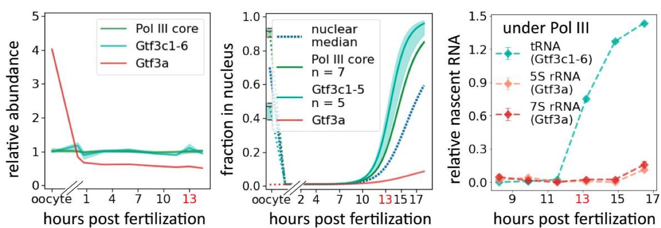 Supplementary Figure 5: Nuclear entry of Pol III and its transcription factors during early development. Embryos developed at 16°C. For complexes with multiple subunits, we represent the median nuclear titration pattern by a solid line and a 50% spread by shaded area with the corresponding color. Source data are provided as Supplementary Data 1,2. Left: Relative protein abundance of Pol III and its associated transcription factors, Gtf3a and Gtf3c1-5, stay approximately constant from fertilization to the ZGA. Middle: Although the core Pol III titrates in the nucleus early, the nuclear entry times of its associated transcription factors vary. In our proteomics analysis, Gtf3c1-5 titrate in the nucleus before Gtf3a. Under Pol III, the transcription factors Gtf3c1-5 (and Pol III) are upstream of tRNAs, while Gtf3a (and Pol III) are upstream of 5S rRNA and 7S rRNA. Right: Quantification of the newly transcribed RNA indicates that tRNA is transcribed much earlier than 5S rRNA and 7S rRNA, which corresponds to the nuclear entry order of their upstream transcription factors. Quantification is from Newport and Kirschner’s RNA gel of newly synthesized transcripts [12]. |