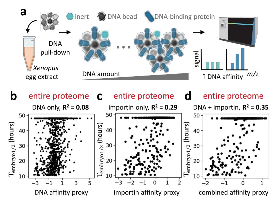 Supplementary Figure 6: Quantification of proteome-wide affinities to plasmid DNA and their correlation with nuclear entry times in early embryos. a, Quantification of proteome-wide protein affinity to DNA. We exposed Xenopus egg lysate to magnetic beads that were covered with plasmid DNA. The pull-down was collected and subjected to MS quantification of the relative protein signal. The experiment was repeated with different DNA to lysate ratios. The DNA affinities at different ratios were projected on one dimension of the canonical coordinate space with cross-validation to produce a DNA affinity proxy for each identified protein [13]. b, Scatter plot of the projected DNA affinity proxy versus Tembryo1/2. The correlation suggests that plasmid DNA affinity explains 8% of the nuclear import variance in the embryos. For technical reasons, we could not perform these assays with frog DNA. Therefore, this assay does not capture protein affinity to frog- specific DNA sequences. c, Scatter plot of the importin affinity proxy versus Tembryo1/2 for all quantified proteins suggests that importin affinities can explain 29% of the of the nuclear import variance in the embryos. d, The combined DNA affinities and importin affinities projected onto a single dimension result in an improved correlation with nuclear entry time, suggesting that together DNA and importin affinities can explain >35% of the variance of observed timing of nuclear entry in early embryos. Shown is the scatter plot between Tembryo1/2 and the projected affinity proxy. |