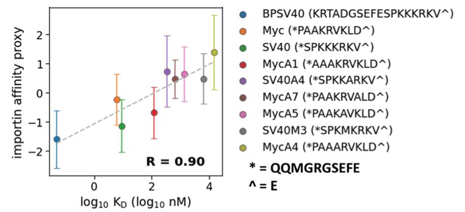 Supplementary Figure 8: Validation of importin affinity assay (Figure 4) using NLS peptides with orthogonally measured KDs [16]. We defined the importin affinity proxy as the free peptide concentration difference between a condition with RanQ69L and a condition without RanQ69L (importin affinity proxy = [free protein+RanQ69L] – [free protein–RanQ69L]). We observed a correlation of 0.90 (R2 = 0.80, two-tailed p-value = 0.001) between our measured importin affinity proxy with the log KDs from Hodel et. al.[16]. The line is a linear fit. Solid dots are the means of importin affinity proxy and error bars indicate standard error (calculated from a set of biological independent replicates, n = 3 controls and 5 RanQ69L added conditions, resulting in 15 biological independent measurements of importin affinity proxy). |