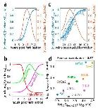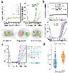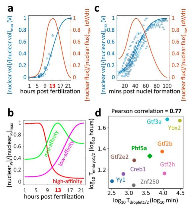 Supplementary Figure 9: Changes of total nuclear volume in embryos and droplet assay; predictions of nuclear concentration for proteins with varying importin affinity in embryos; Scatter plot of nuclear import timing cell-free assay and embryos. a, Total nuclear volume, and nuclear protein flux as functions of time in developing X. laevis embryos. Each dot indicates measurements of total nuclear volume based on immunofluorescence from one embryo. A spline fit (blue curve) provides the functional form of the changes in nuclear volume over time. The time derivative of nuclear volume expansion is the nuclear flux due to nuclear import (orange curve). The maximum volume during this time normalizes the nuclear volume (y-axis left), and the nuclear flux is normalized by the maximum flux (y-axis right). The decline in the total nuclear import rate might be due to the previously reported sequestration of importin α to the cellular membrane17,18. b, Our model predicts the changes in nuclear concentration over increasing embryonic nuclear volume for three proteins with different affinities to importin. The three proteins sequentially reach their maximal nuclear concentration from the highest affinity protein to the lowest affinity protein. After the maximum is reached, a further nuclear volume increase leads to a decline in nuclear concentration. c, Nuclear volume and nuclear flux as functions of time in oil encapsulated cytoplasmic droplets. Similar to (a), the nuclear volume per cell-free droplet is shown to increase with time in the raw imaging data (blue dots) and is fit by a spline function (blue curve). The function’s time derivative is the nuclear flux over time (orange curve). T = 0 is when the cytoplasm is taken off ice, and nuclear formation is initiated. d, Comparing the time measurement of nuclear import in (Tdroplet1/2) from the cell-free assay and the log import time (Tembryo1/2) for the nine TFs show strong agreement (Pearson correlation of 0.77, two- tailed p-value = 0.01). |