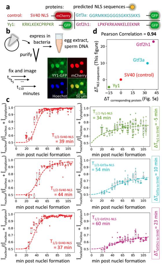 Supplementary Figure 10: Import kinetics of NLS-GFP fusions correlate with import kinetics of the NLS-origin proteins. a, We transferred the bioinformatically predicted NLS sequence from proteins assayed in Figure 5, Yy1 (a fast-imported protein ΔTdroplet1/2 = -15.0 min) and the slow-imported proteins Gtf2h1 (ΔTdroplet1/2 = 41.1 min), and Gtf3a (ΔTdroplet1/2 = 33.6 min), to bacterially expressed GFP [19]. b, Experimental procedure. We expressed GFP with the predicted NLS signals from Yy1, Gtf2h1, and Gtf3a to perform nuclear import assays. We added these expressed constructs at the same concentration as the reference SV40-NLS-mCherry into Xenopus egg extracts doped with sperm DNA. We collected samples every 5 minutes and imaged nuclear import with confocal microscopy. c, We monitored the nuclear import kinetic of NLS-GFP and SV40-NLS-mCherry, and fit the data with a sigmoid to extract the time (T1/2). We calculate the import time difference (ΔT) between SV40-NLS- mCherry and the NLS of interest to overcome extract variability. Markers represent the raw measurements (n ≥ 5 replicates), and the box plot shows the spread of measurement data for all the nuclei at each time point. Lines are sigmoid fits. Source and analyzed data are provided as Supplementary Data 7. d, A scatter plot summarizes the result from the import kinetics of GFP with transferred NLS and import kinetics of the corresponding protein. We observe a good correlation (Pearson correlation of 0.94, two-tailed p-value = 0.006) between T1/2 of NLS-GFP constructs measured in the bulk extract and the ΔTdroplet1/2 of proteins measured in the droplet assay. Box plots show the range from the first quartile to the third quartile with the center mark representing the median value. The whiskers represent 1.5*IQR of the distribution. |