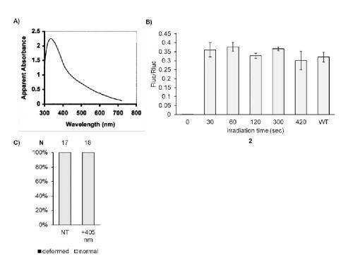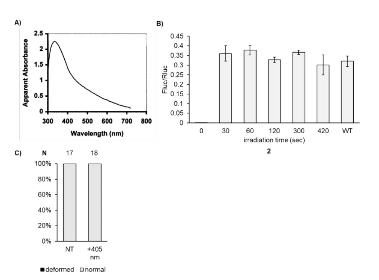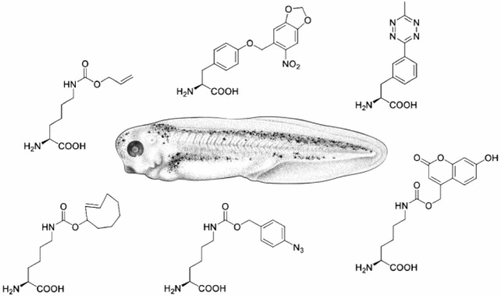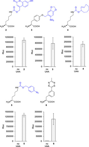 Figure 2. Genetic encoding of UAAs 2–6 in Xenopus embryos. Structures of 2–6. Blue represents caging groups that are removed after treatment with 405 nm light or a small molecule trigger. Incorporation of 2–6 into the luciferase reporter was accomplished after injection of all components, including 2, 4, and 5, while UAAs 3 and 6 were added to the media. Embryos were incubated at 23 °C, and assays were conducted at 24 hpf. Bars represent means, and error bars represent standard deviations of measurements from three independent embryos.
