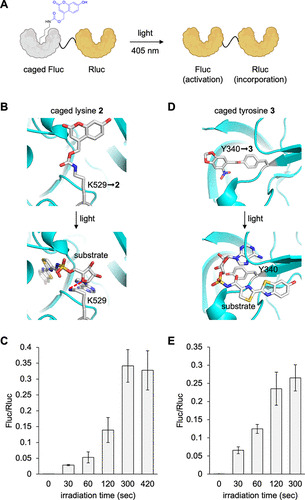 Figure 3. Conditional control of enzymatic activity with photocaged UAAs 2 and 3. (A) Luciferase enzymatic activation in Xenopus embryos with light. Structural representation of caging of the Fluc active site with either (B) 2 or (D) 3 before and after irradiation (PDB: 4G36). Incorporation of (C) 2 or (E) 3 into the dual luciferase reporter and irradiation for increasing duration with a 405 nm light at 24 hpf. Bars represent means, and error bars represent standard deviations of measurements from three independent embryos.