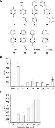 Figure 4. Conditional control of enzymatic activity through the incorporation of 4. (A) Chemical structures of the different tetrazines tested for decaging of 4 in vivo. (B) Tetrazine screen of dual-luciferase reporter activation. (C) Tetrazine 7 incubation timecourse. Bars represent mean, and error bars represent standard deviation of measurements from three independent embryos. No tet = no tetrazine control.