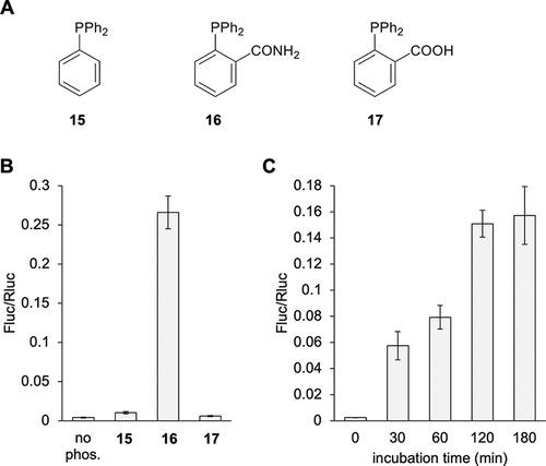 Figure 5. Conditional control of enzymatic activity through phosphine-based decaging of 5 incorporated into protein. (A) Chemical structures of the different phosphines tested. (B) Phosphine screen of dual-luciferase reporter activation. (C) Incubation timecourse with 16. Bars represent mean, and error bars represent standard deviation of measurements from three independent embryos. No phos. = no phosphine control.