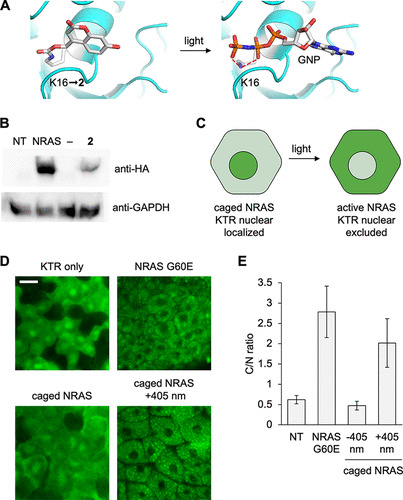 Figure 6. Optical control of NRAS activity using photocaged lysine 2. (A) Structural representation of caging of the NRAS active site with 2 (PDB: 5UHV). (B) Western blot of incorporation of 2 into NRAS. (C) Caging of NRAS blocks its activity in the absence of light, and the ERKKTR-Clover reporter is nuclear localized. Irradiation at 405 nm activates NRAS, which leads to ERK activation and nuclear exclusion of the KTR. (D) Representative confocal images of the KTR reporter for each condition. Scale bar: 20 μm. (E) Quantification of the fluorescent cytosol/nucleus ratio. Bars represent means, and error bars represent standard deviations of measurements from 15 cells and three different embryos.