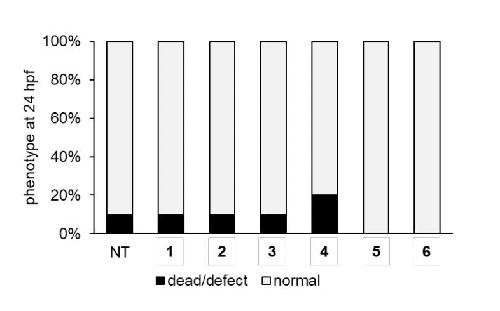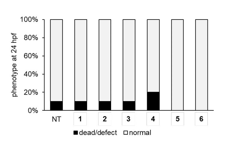 Figure S3. Toxicity assay of UAAs 1-6 in xenopus embryos measured at 24 hpf. A volume of 5 nl