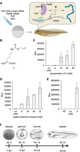 Figure 1. Genetic code expansion in Xenopus. (A) Injection and UAA incorporation into a protein of interest (POI) in embryos. (B) Structure of 1. (C) Titration of 1 in the injection solution and incorporation into Rluc95UAG. (D) Incorporation of 1 (10 mM) over the first 72 h of development. (E) Incorporation of 1 into Rluc95UAG at 16 °C. All bars are means, and error bars are standard deviations from three embryos. (F) Nieuwkoop Faber (NF) stages of Xenopus embryos at certain time points at 23 °C. Panel F reproduced with permission from ref (37). Copyright 2022 The Company of Biologists. NT = nontreated embryo control. hpf = hours post-fertilization.