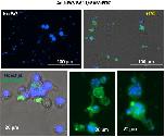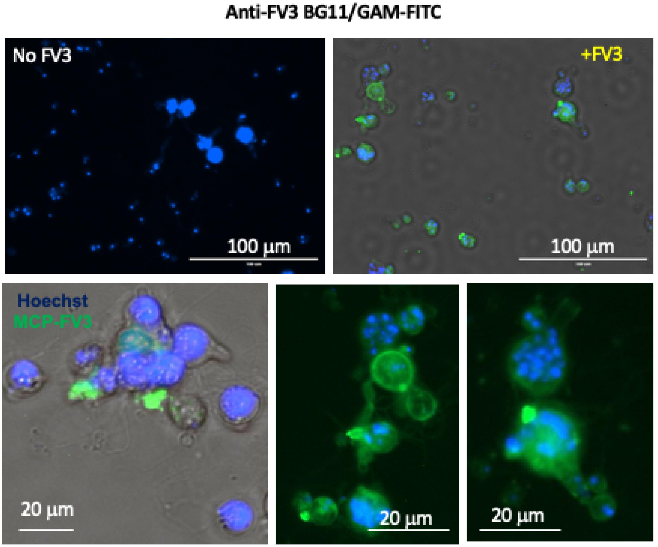 Figure 1. Detection of FV3 binding to Bd using fluorescence microscopy. FV3 was added to Bd culture at 1 MOI in 1 mL volume and incubated for 24 h. Detection of FV3 was performed by staining with the anti-MCP mAb BG11 followed by FITC-conjugates goat anti-mouse Ab. Nuclei were stained with Hoechst. Negative control, Mock FV3-exposed Bd culture. Stained samples were visualized under a EVOS FL Digital Inverted Fluorescence Microscope.