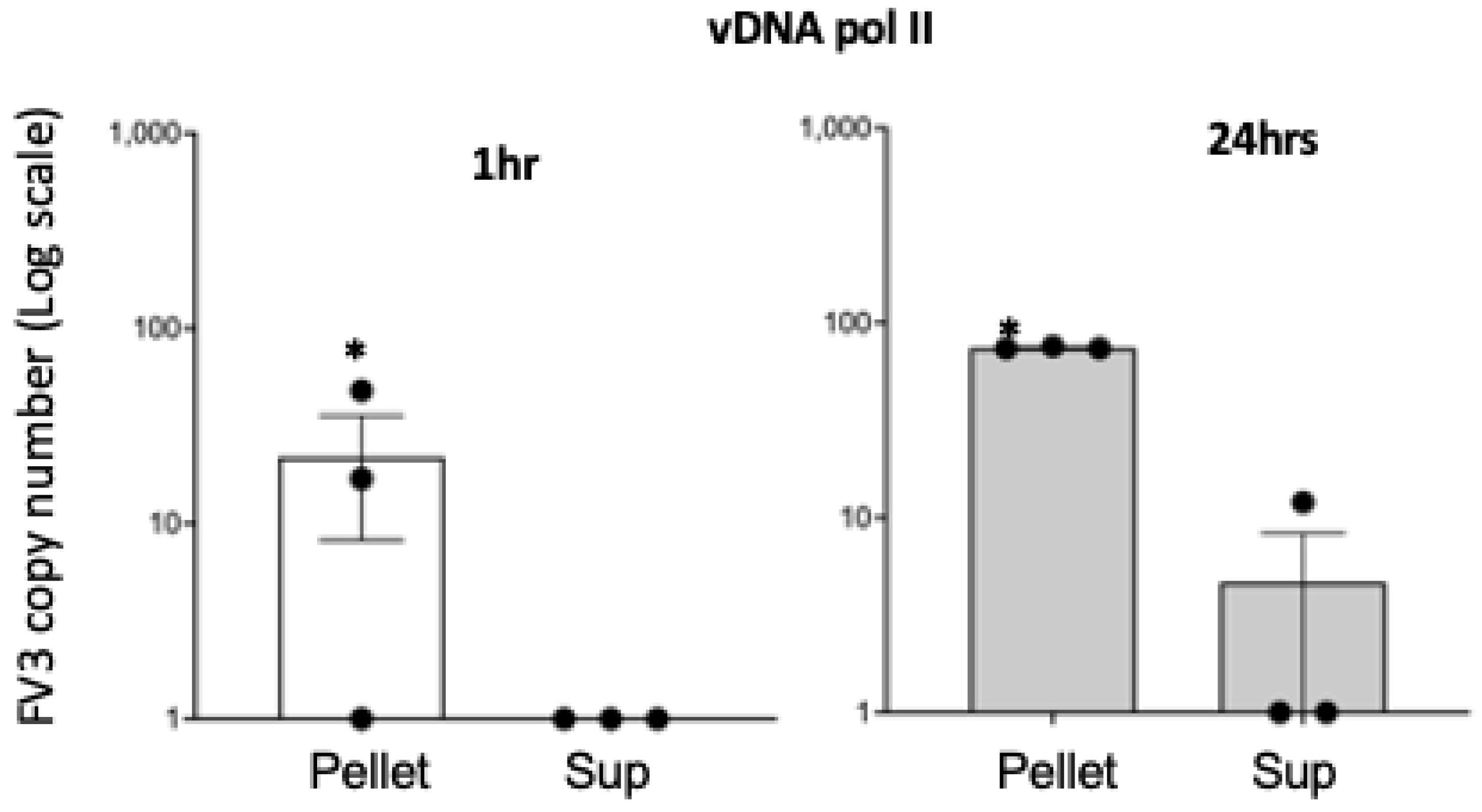 Figure 2. Detection of FV3 binding to Bd using qPCR. FV3 was incubated with Bd at 1 MOI in 1 mL volume for 1 and 24 h. Samples were then centrifuged at 700× g and both pellets and supernatants were subjected to qPCR with FV3 specific primers (vDNA pol). * Statistical differences (p < 0.05).