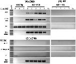 Figure 6. FV3 infection of Bd detected using RT-PCR. FV3 was incubated with Bd at 1 MOI in 1 mL volume for 24 h. RT-PCR on DNAse-treated RNA was performed using a primer specific for early (vDNA pol) and late (MCP) FV3 genes (A). To control for viral genomic contamination, the same amount of RNA was assayed in absence of reverse transcriptase (B). As an additional control, the same assay was performed with heat-killed Bd (C).