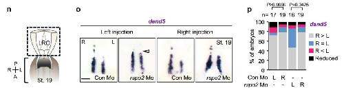Fig. 1: Rspo2 is expressed in the LRO and is required for LR specification. [ panels n-p] n Scheme of dorso-posterior explants. A anterior, P posterior, R right, L left. o WISH of dand5 in Xenopus LRO (St. 19) injected as indicated. Arrowhead, derepression of dand5. Scale bar, 100 µm. p Quantification of (o). Data information: Two-sided Fisher’s exact test used for all statistical analyses. n = number of analyzed embryos. Source data are provided as a Source Data file. |