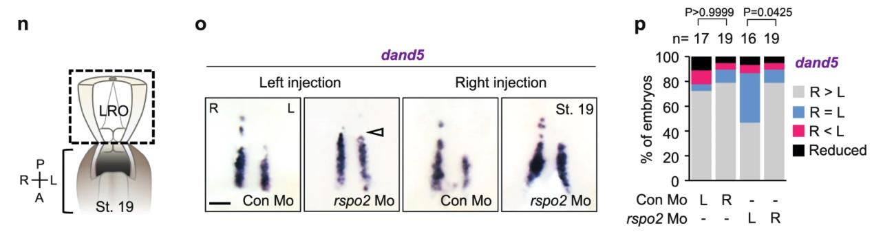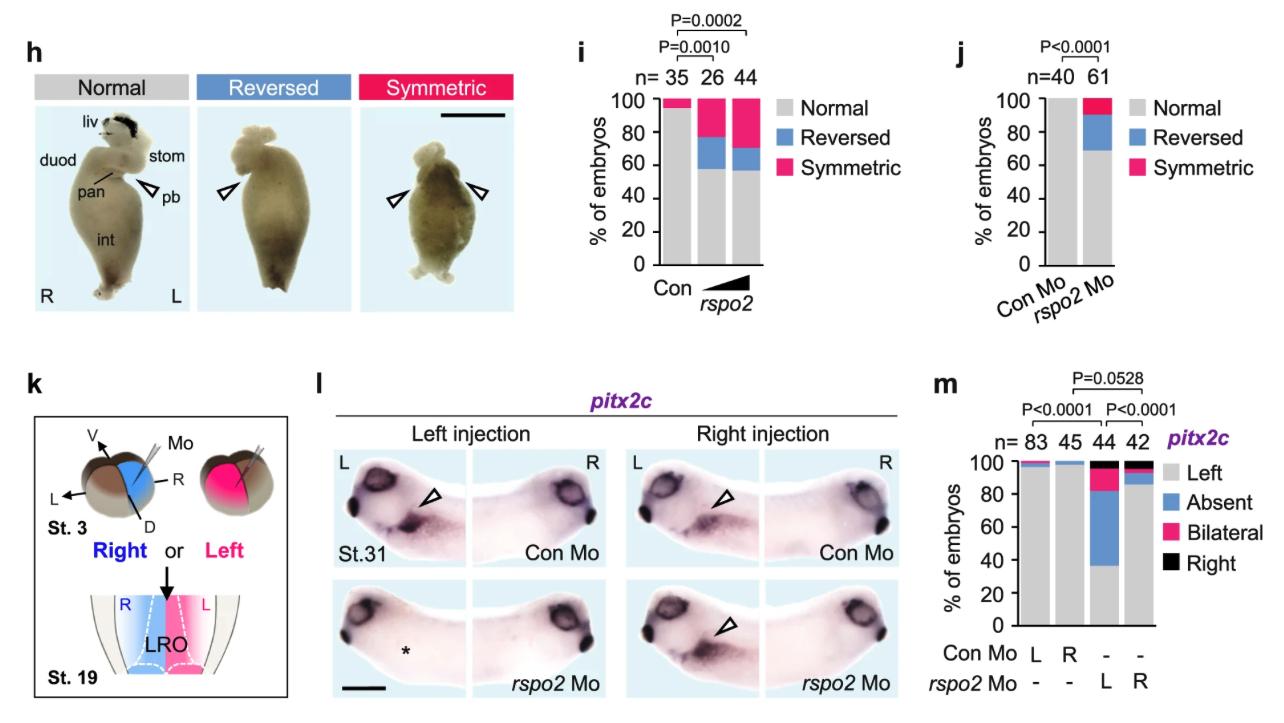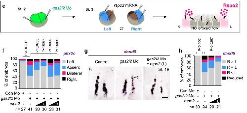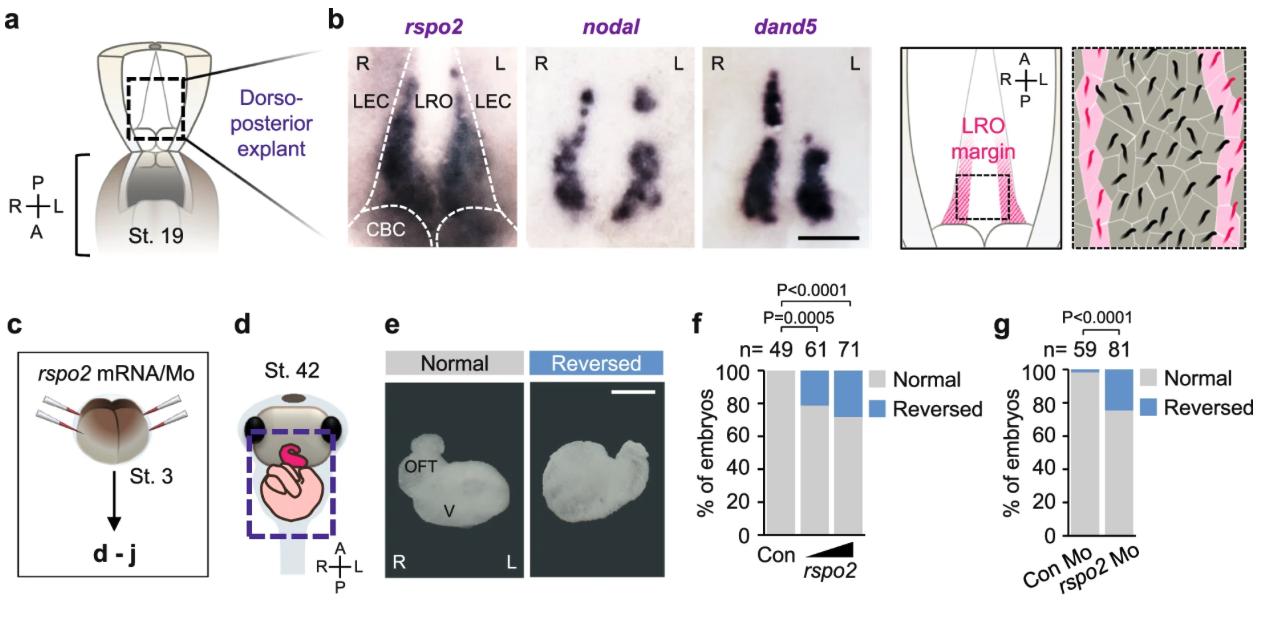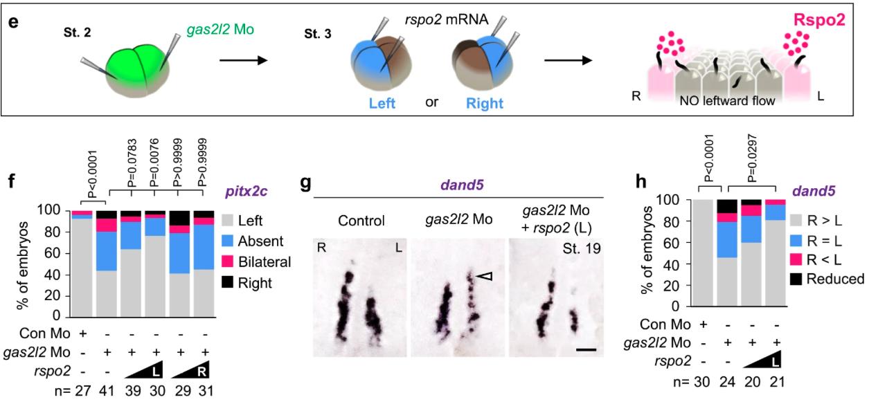 Fig. 2: Rspo2 is a sinistralizing signal in the left-right organizer. panels e-h] e Microinjection strategy for (f–h). f Quantification of pitx2 in Xenopus tailbuds (St. 31) injected as indicated. L left-blastomeres injection, R right-blastomeres injection. n = number of embryos. g WISH of dand5 in Xenopus LRO (St. 19). Arrowheads, dand5 derepression. Scale bar, 100 µm. h Quantification of (g). n = number of dorso-posterior explants. |
