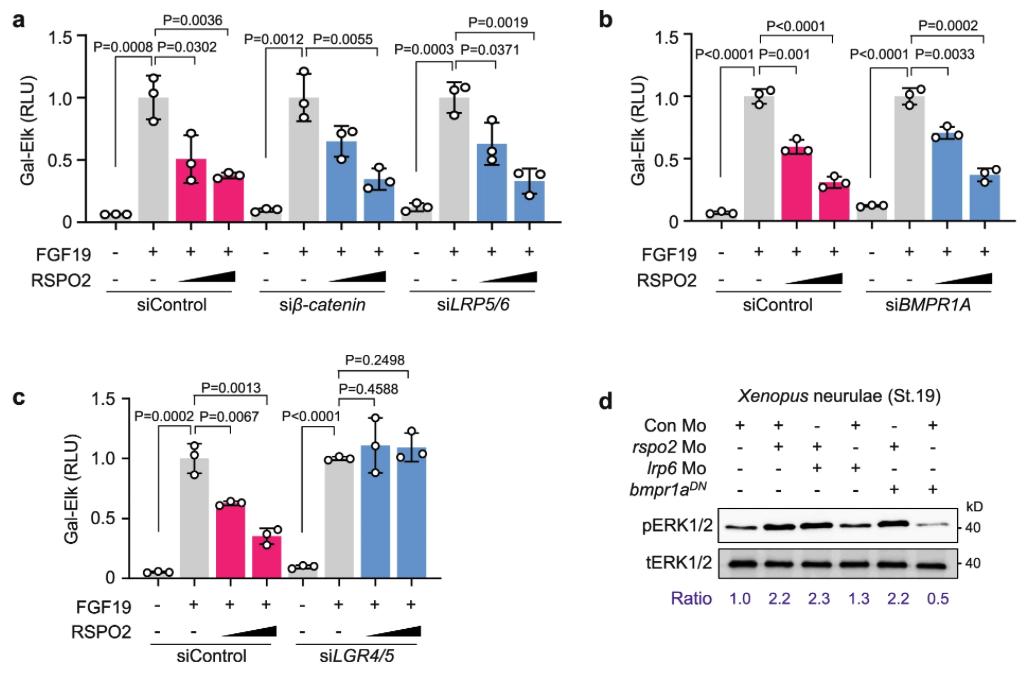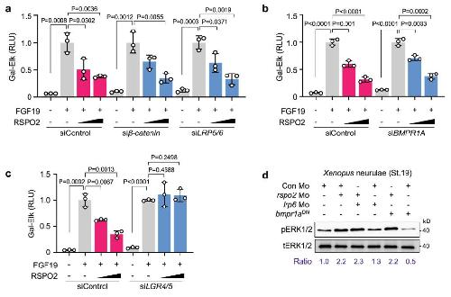 Fig. 4: RSPO2 antagonizes FGF19-FGFR4 signaling Wnt and BMP independently. [panels a-d] a, b FGF-responsive GAL-Elk1 luciferase reporter assays in HEPG2 cells treated as indicated. c GAL-Elk1 luciferase reporter assays in HEPG2 cells treated as indicated. d Western blot analysis in Xenopus neurulae (St. 19) injected as indicated. Source data are provided as a Source Data file. |