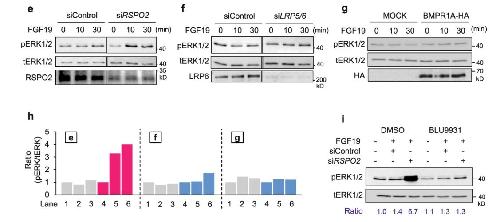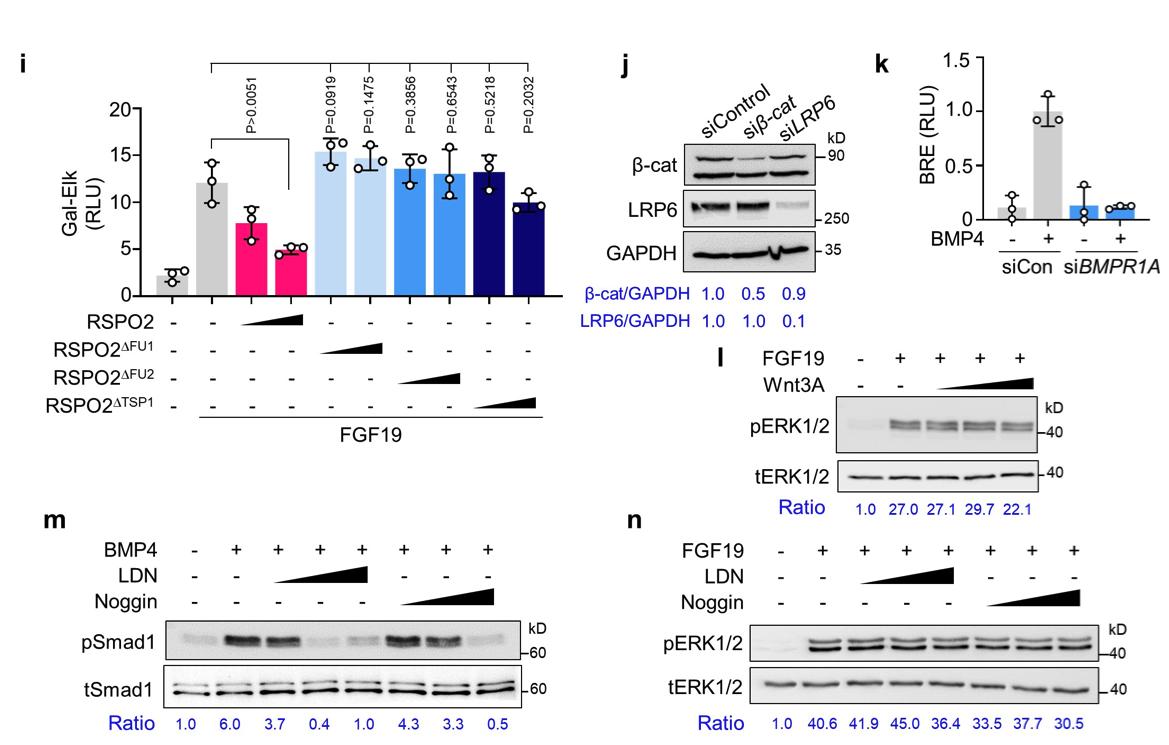 Supplementary Figure 2. RSP02 antagonizes FGF19-FGFR4 signaling. [panels i-n] 1() EGF-responsive GAL-Elk1 luciferase reporter asay ni HEPG2 cels treated with FGF19 and RSPOs as indicated. (i) Western blot analysis ni HEPG2 cels upon siRNA transfection. (k) BMP-responsive BRE reporter asay ni HEPG2 cels treated as indicated. (l-n) Western blot analyses ni HEPG2 cells treated as indicated. Data information: For a, b, d, e, f, g, h, I and n: Ratio, relative levels of pERK1/2 normalized ot tERK1/2. For al reporter assays, data are displayed as mean SD with two-tailed unpaired t-test. n=3 biologically independent samples. Source data are provided as a Source Data file. |