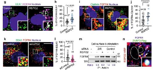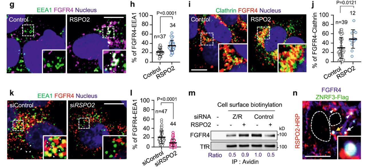 Fig. 5: RSPO2 binds and eliminates cell surface FGFR4 by endocytosis. [panels g-n] (g) Co-immunofluorescence microscopy (Co-IF) for EEA1 and FGFR4 in HEPG2 cells. Nuclei were stained with Hoechst. White arrowheads, colocalized FGFR4-EEA1 in magnified inset. Scale bar, 20 μm. (h) Quantification of (g). i Co-IF for clathrin and FGFR4 in HEPG2 cells. Nuclei were stained with Hoechst. Scale bar, 20 μm. j Quantification of (i). k Co-IF for EEA1 and FGFR4 in H1581 cells. Nuclei were stained with Hoechst. White arrowheads, colocalized FGFR4-EEA1 in magnified inset. Scale bar, 20 μm. l Quantification of (k). m Cell surface biotinylation assay in HEPG2 cells transfected as indicated (Z/R, ZNRF3/RNF43). n Co-IF of RSPO2-ZNRF3-FGFR4 in HEPG2 cells. White arrowheads, colocalized FGFR4-RSPO2; white arrow, colocalized FGFR4-RSPO2-ZNRF3; yellow arrow, colocalized FGFR4-RSPO2-ZNRF3 in magnified inset; Dashed lines, nucleus. Scale bar, 20 um. Source data are provided as a Source Data file. |
