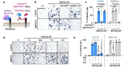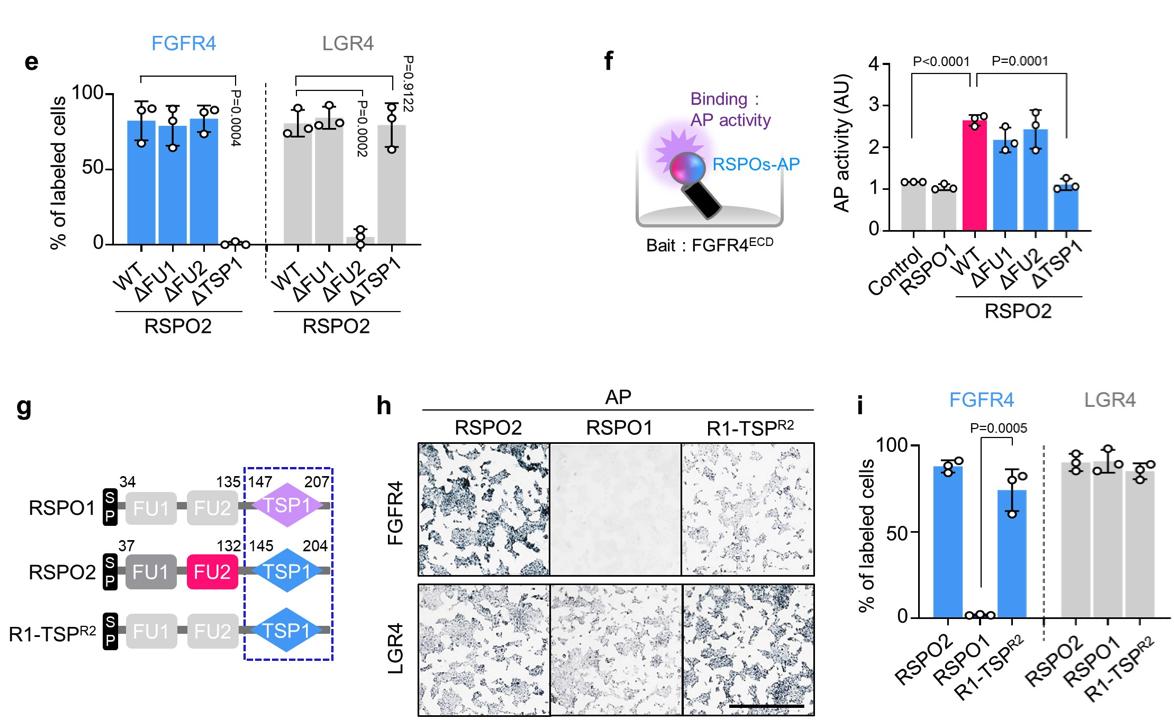 Supplementary Figure 3. RSP02 interacts with FGFR4 via the TSP1 domain. [panels e-i] e) Quantification of Figure 6e and (d). n=3 biologicaly independent samples. Data are displayed as means SD with two-tailed unpaired t-test. (f) (Left) Scheme of analysis. (Right) In vitro binding assay between RSPOs and FGFR4. n=3 experimentaly independent samples. Data are displayed as means SD with two-tailed unpaired-t (g) Domain structures of the RSPOl, 2- and R1-TSPR2. Dashed box denotes the TSP1 domain swapping. (h) Cel surface binding assay ni HEK293T cels. Scale bar, 1mm. (i) Quantification of (h). n=3 biologically independent samples. Data information: Data are displayed as means SD with two-tailed unpaired t-test. Source data are provided as a Source Data file. |