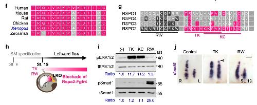 Fig. 6: TK peptide disrupts RSPO2-FGFR4 interaction and derepresses dand5 in the LRO. [panels f-j] f Amino acid sequence comparison of TK-KC peptides in RSPO2 TSP1 domain of several species. Note that TK-KC peptide sequence is highly conserved (Magenta boxes). g Amino acid sequence comparison of RSPO1-4 TSP1 domains. Note that TK-KC peptide sequence derived from human RSPO2 TSP1 domain is unconserved in other RSPOs (Magenta boxes). h Microinjection strategy for (i–k). i Western blot analysis of phosphorylated ERK1/2 and Smad1 (pERK1/2 and pSmad1) and total ERK1/2 and Smad1 (tERK1/2 and tSmad1) in Xenopus embryo (St. 15) lysates. j WISH of dand5 in Xenopus LRO (St. 19) injected as indicated. Arrowheads, dand5 derepression. Scale bar, 100um. Source data are provided as a Source Data file. |