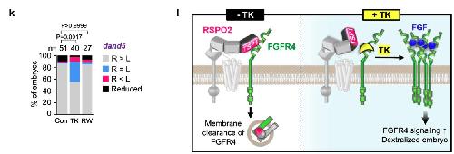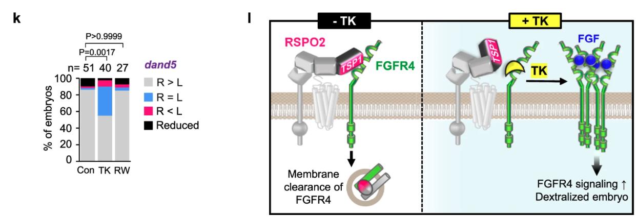Fig. 6: TK peptide disrupts RSPO2-FGFR4 interaction and derepresses dand5 in the LRO. [panels k-l] k Quantification of (j). Two-sided Fisher’s exact test used for statistical analysis. n = number of dorso-posterior explants. l Model showing the mode of action for TK to intervene RSPO2-FGFR4 interaction and increases FGFR4 signaling. Data information: For all cell surface binding assays (c, e), data are displayed as mean ± SD with two-tailed unpaired t-test: n = 3 biologically independent samples. Source data are provided as a Source Data file. |