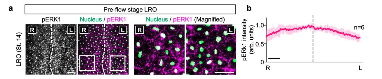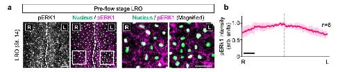 Supplementary Figure 7. Rspo2 is required for LR asymmetric ERK1/2 phosphorylation in the LRO. [panels a-d] (a-d) Brightfield image of the LRO explants immunostained with phosphorylated ERK1 (pERK1) shown ni Figure .7 R, right; L, left. White dashed line, midline; Black dashed box, area of FI shown in Figure 7. [panels a-d] |