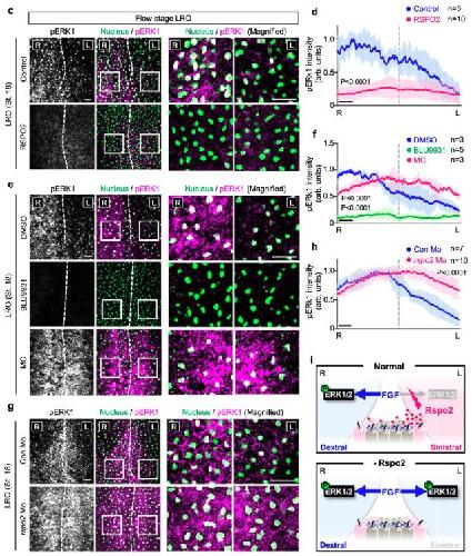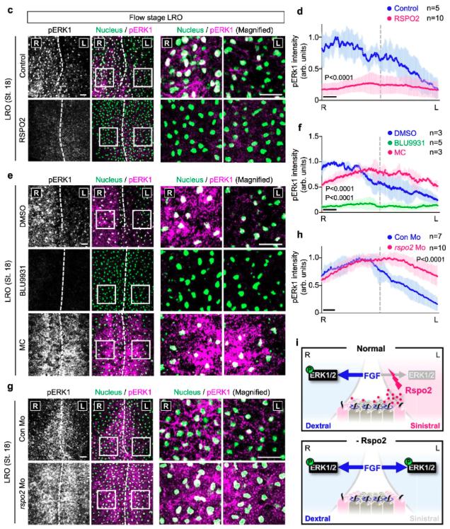 Fig. 7: A LR-FGF signaling gradient in the LRO that requires Rspo2 and ciliary flow. [panels c - g] a, c, e, g Immunofluorescence microscopy (IF) for phosphorylated ERK1 (pERK1) in the LRO from Xenopus St.14 (a) or St. 18 (c, e, g) neurula. Nuclei were stained with Hoechst. R right, L left. Dashed line, midline in the LRO. White boxes are magnified in right panels. Scale bar, 50 μm. b, d, f, h Normalized pERK1 intensity profile for the LRO explants in (a, c, e, g). n = number of LRO explants. Blue, magenta, and green lines, mean pERK1 intensity. Blue, magenta, and green shades, ±SD. The highest mean pERK1 intensity on the right side of control LRO (b, d), DMSO-injected LRO (f), or control Mo-injected LRO (h) was set to 1. R right, L left. Dashed line, dorsal midline. Scale bar, 50 μm. i Anti-FGF signaling by Rspo2 is required to establish a LR-FGF signaling gradient in the LRO. Data information: Two-tailed paired t-test was used for all statistical analyses. Source data are provided as a Source Data file. |