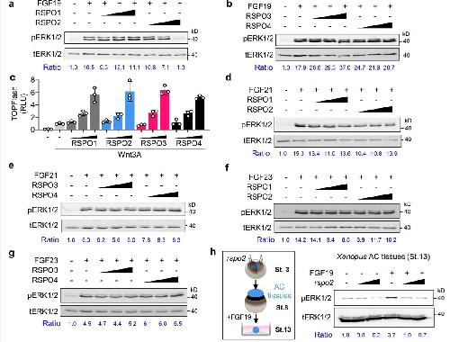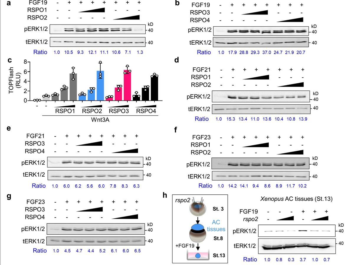 Supplementary Figure 2. RSP02 antagonizes FGF19-FGFR4 signaling. [panels a-h] (a-b) Western blot analyses of phosphorylated ERK1/2 (pERK1/2) and total ERK1/2 (tERK1/2) ni HEPG2 cels stimulated by FGF19, treated with or without increasing amount of RSPOs for 30 min as indicated. (c) TOPFlash reporter asay ni HEK293T cels treated with Wn3tA and RSPOs as indicated. (d-g) Western blot analyses of pERK1/2 and tERK1/2 ni HEPG2 cels stimulated by FGF21 or FGF23, treated with or without increasing amounts of RSPOs for 03 mni as indicated. (h) (Left) Scheme of analysis. (Right) Western blot analysis of pERK1/2 and tERK1/2 ni Xenopus animal cap explants treated with FGF19 from S.t 8ot S.t 13. |