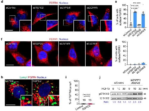 Supplementary Figure 4. RSPO2 removes cell surface FGFR4. [panels d-j] (d) FI of endogenous FGFR4 ni H1581 cells upon siRNA transfection as indicated. Nuclei were stained with Hoechst. Scale bar, 20 um. (e) Quantification of cels harboring surface FGFR4 from (e). Data are displayed as mean SD with two-tailed unpaired t-test. =n 3 biologically independent experiments. (1) FI of endogenous FGFR1 ni H1581 cels upon siRNA transfection as indicated. Nuclei were stained with Hoechst. Scale bar, 20 um. =n single experiment. (g) Quantification of cells harboring surface FGFR1 from (f). (h) Co-IF of Lamp1-FGFR4 ni HEPG2 cells upon RSPO2 treatment. Nuclei were stained with Hoechst. Scale bar, 20 um. (i) Quantification of (h). Data are displayed as mean SD with two-tailed unpaired t-test. =n number of cells. (j) Western blot analysis ni H1581 cels treated with siRNA and stimulated by FGF19 as indicated. Ratio, relative levels of pERK1/2 normalized ot tERK1/2. Source data are provided as a Source Data file. |