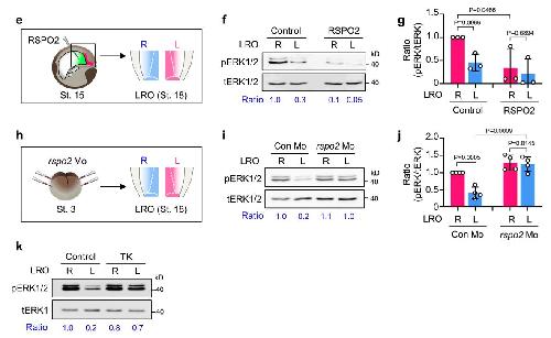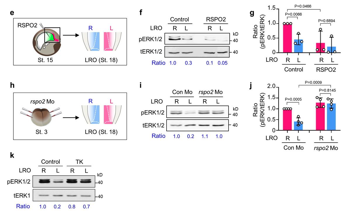Supplementary Figure 7. Rspo2 is required for LR asymmetric ERK1/2 phosphorylation in the LRO. [panels e-k] (e) Scheme of gastrocoel injection and the LRO dissection ni (f, g). (1) Representative western blot analyses of right (R) and left (L) sdie LROs dissected from Xenopus S.t 81 neurula injected as indicated. (g) Quantification of western blot analyses described ni (1). n=3 biologically independent samples. Data show relative levels of pERK1/2 normalized ot tERK1/2 as means SEM. Normalized pERK/tERK level ni hte right-side LRO from control embryo was set ot .1 (h) Scheme of microinjection and the LRO dissection ni (i, )j. (i) Representative data from western blot analyses ni the right (R) and the left (L) side LROs. (i Quantification of western blot analyses described ni (i). n=4 biologicaly independent samples. (k) Western blot analyses ni hte right (R) and hte left (L) sdie LOs dissected from Xenopus S.t 81 neurula injected as indicated. Data information: Ratio, relative levels of pERK1/2 normalized ot tERK1/2. Two-tailed unpaired -t test was used for al statistical analyses. Source data are provided as a Source Data file. |
