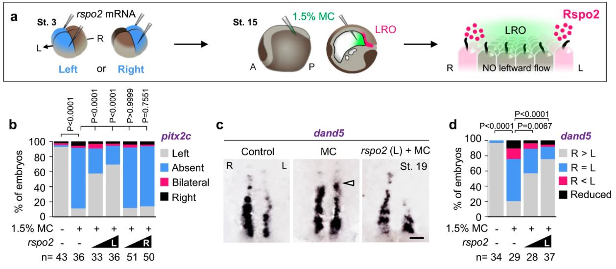 Fig. 2: Rspo2 is a sinistralizing signal in the left-right organizer. [panels a-d] a Microinjection strategy for (b–d). MC, methylcellulose. b Quantification of pitx2 in Xenopus tailbuds (St. 31) injected as indicated. L left-blastomeres injection, R right-blastomeres injection. n = number of embryos. c WISH of dand5 in Xenopus LRO (St. 19). Arrowheads, dand5 derepression. Scale bar, 100 µm. d Quantification of (c). n = number of dorso-posterior explants. |