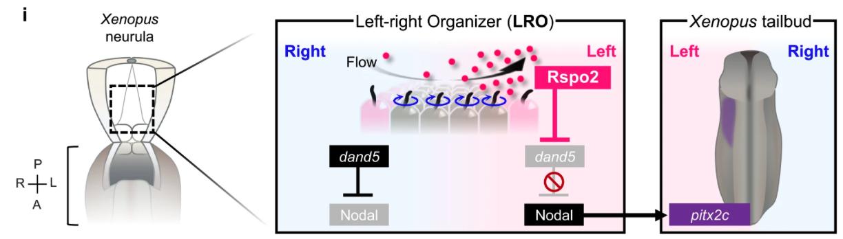 Fig. 2: Rspo2 is a sinistralizing signal in the left-right organizer. [panel i] i Model for Rspo2 function as a leftward signal in Xenopus LRO. Data information: Two-sided Fisher’s exact test used for all statistical analyses. Source data are provided as a Source Data file. |