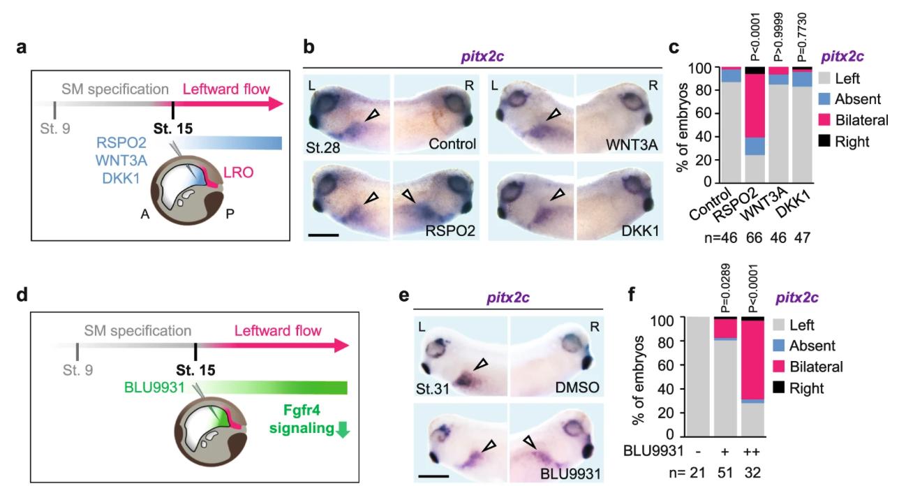 Fig. 3: Rspo2 regulates LR asymmetry by antagonizing Fgfr4 in the LRO. [panels a-f] a Gastrocoel microinjection strategy for (b, c). Schematic representation of Xenopus neurula (St. 15) is shown in sagittal section indicating the LRO (magenta). SM, superficial mesoderm. b WISH of pitx2c in Xenopus tailbuds (St. 31) injected with recombinant proteins. Left (L) and right (R) sides of the same embryos are shown. Arrowheads, pitx2c at the LPM. Scale bar, 0.5 mm. c Quantification of (b). n = number of embryos. d Gastrocoel microinjection strategy for (e, f). e WISH of pitx2c in Xenopus tailbuds (St. 31) injected with BLU9931. Arrowheads, pitx2c expression at the LPM. Scale bar, 0.5 mm. f Quantification of (e). n = number of embryos. Source data are provided as a Source Data file. |