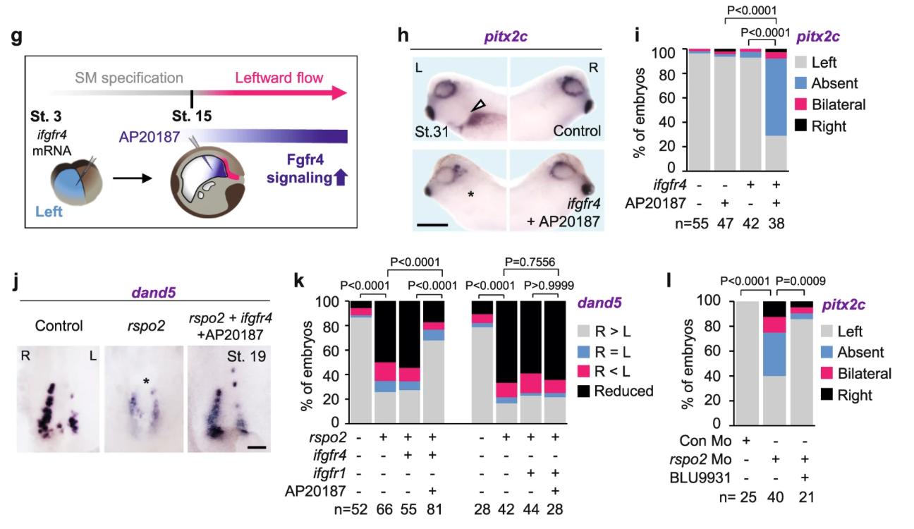 Fig. 3: Rspo2 regulates LR asymmetry by antagonizing Fgfr4 in the LRO. [panel m] m Anti-FGF signaling by Rspo2 controls LR-symmetry breakage in the LRO. Data information: Two-sided Fisher’s exact test used for all statistical analyses. Source data are provided as a Source Data file. |