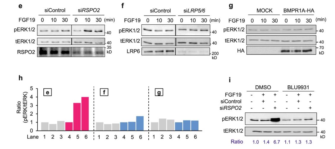 Fig. 4: RSPO2 antagonizes FGF19-FGFR4 signaling Wnt and BMP independently. [panels e-i] e–g Western blot analyses in H1581 cells treated with siRNA and stimulated by FGF19 as indicated. h Quantification of (e–g). Ratio, relative levels of pERK1/2 normalized to tERK1/2. i Western blot analysis in H1581 cells treated as indicated. Ratio, relative levels of pERK1/2 normalized to tERK1/2. Data information: For all reporter assays, data are displayed as mean ± SD with two-tailed unpaired t-test. n = 3 biologically independent samples. Source data are provided as a Source Data file. |