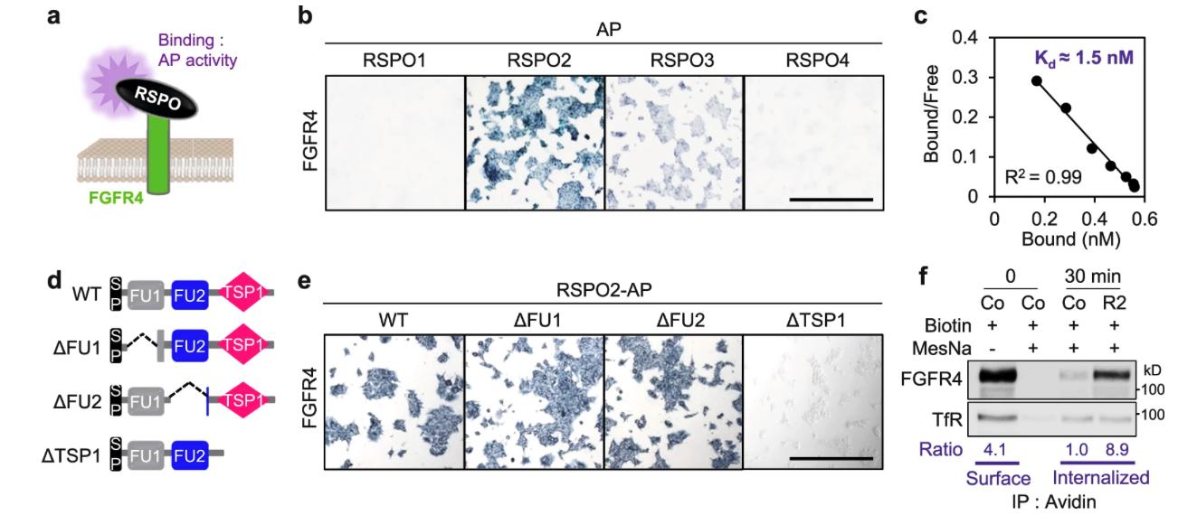 Fig. 5: RSPO2 binds and eliminates cell surface FGFR4 by endocytosis. [panels a-f a Scheme of RSPOs cell surface binding assays in (b, e). b Representative images of HEK293T cells transfected and treated as indicated. Scale bar, 1 mm. c Scatchard analysis of RSPO2 and FGFR4ECD binding. d Domain structures of RSPO2 and deletion mutants. SP signal peptide, FU furin domain, TSP1 thrombospondin domain 1. e Representative images of HEK293T cells transfected and treated as indicated. Scale bar, 1 mm. f Receptor internalization assay in HEPG2 cells treated with control (Co) or RSPO2 medium (R2) as indicated. TfR, transferrin receptor. Source data are provided as a Source Data file. |