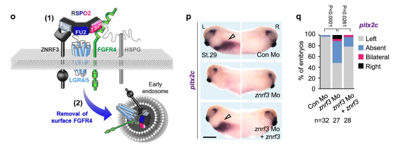 Fig. 5: RSPO2 binds and eliminates cell surface FGFR4 by endocytosis. [panelso-q] o Model showing (1) RSPO2-LGRs-ZNRF3-FGFR4 complex at the cell surface and (2) membrane clearance of FGFR4 by endocytosis. p WISH of pitx2c in Xenopus tailbuds (St. 29). Arrowheads, pitx2c at the LPM. Scale bar, 0.5 mm. q Quantification of (p). Two-sided Fisher’s exact test used for statistical analysis. n = number of embryos. Data information: For all Co-IF analyses h, j, l data are displayed as mean ± SD with two-tailed unpaired t-test. n = number of cells. Source data are provided as a Source Data file. |