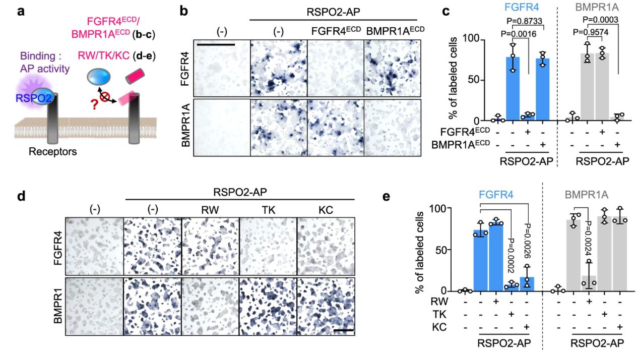 Fig. 6: TK peptide disrupts RSPO2-FGFR4 interaction and derepresses dand5 in the LRO. [panels a-e] a Scheme of cell surface competitive binding assays in (b–e). b Representative images of HEK293T cells transfected and treated as indicated. Scale bar, 1 mm. c Quantification of (b). d Representative images of HEK293T cells transfected and treated as indicated. Scale bar, 1 mm. e Quantification of (d). Source data are provided as a Source Data file. |